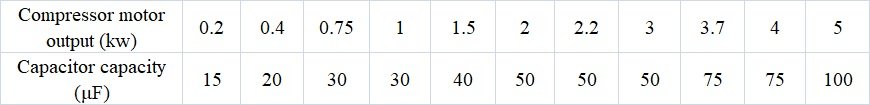 Nachdem der Kondensator zusammengebrochen ist (kann nicht reparieren), Sie müssen ihn durch einen neuen Kondensator des gleichen Modells ersetzen. Um die Auswahl bei der Reparatur zu erleichtern, Die folgende Tabelle listet die passende Kapazität des Kondensators und die Ausgangsleistung des Kompressormotors auf, genießen.