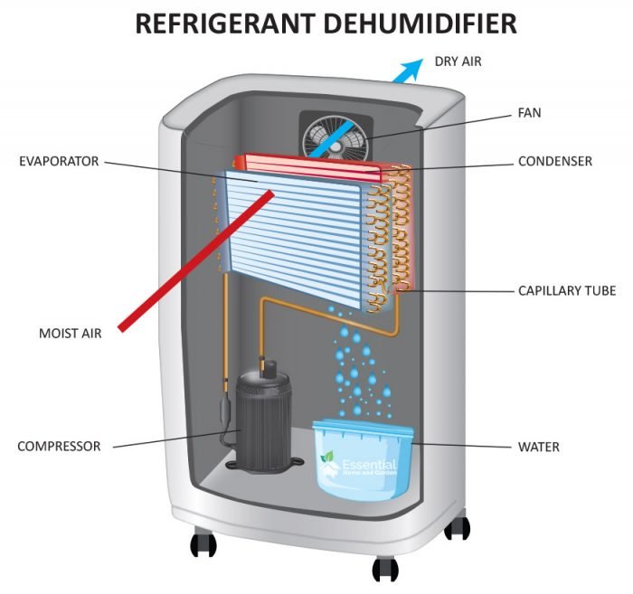 I componenti principali del deumidificatore: ventola del motore, compressore, condensatore, evaporatore, soprattutto gli ultimi tre, che non sono disponibili nel purificatore d'aria.